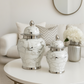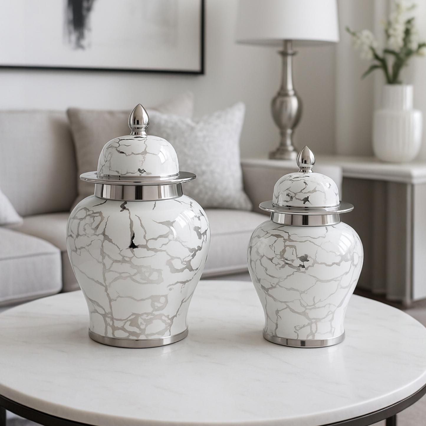 An urn with silver details. Alley Vase is a French style craft, which is made of ceramic. It has a marble pattern that gives it extra exclusivity. A multi-functional ornament, where it can be deliciously left empty or filled with flowers for a more exquisite look.