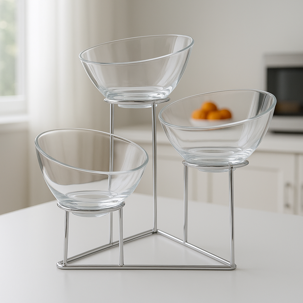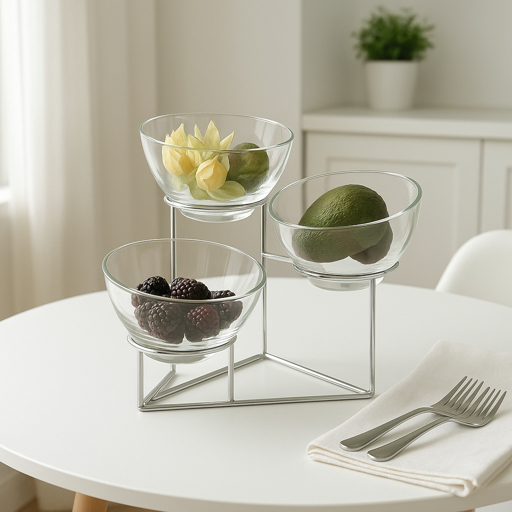 Multi-layer fruit bowls - 3 parts. A very creative silver colored stand for your favorite snacks. With our Triple Snack Stand l, you get the opportunity to display and serve your snacks in a unique way.