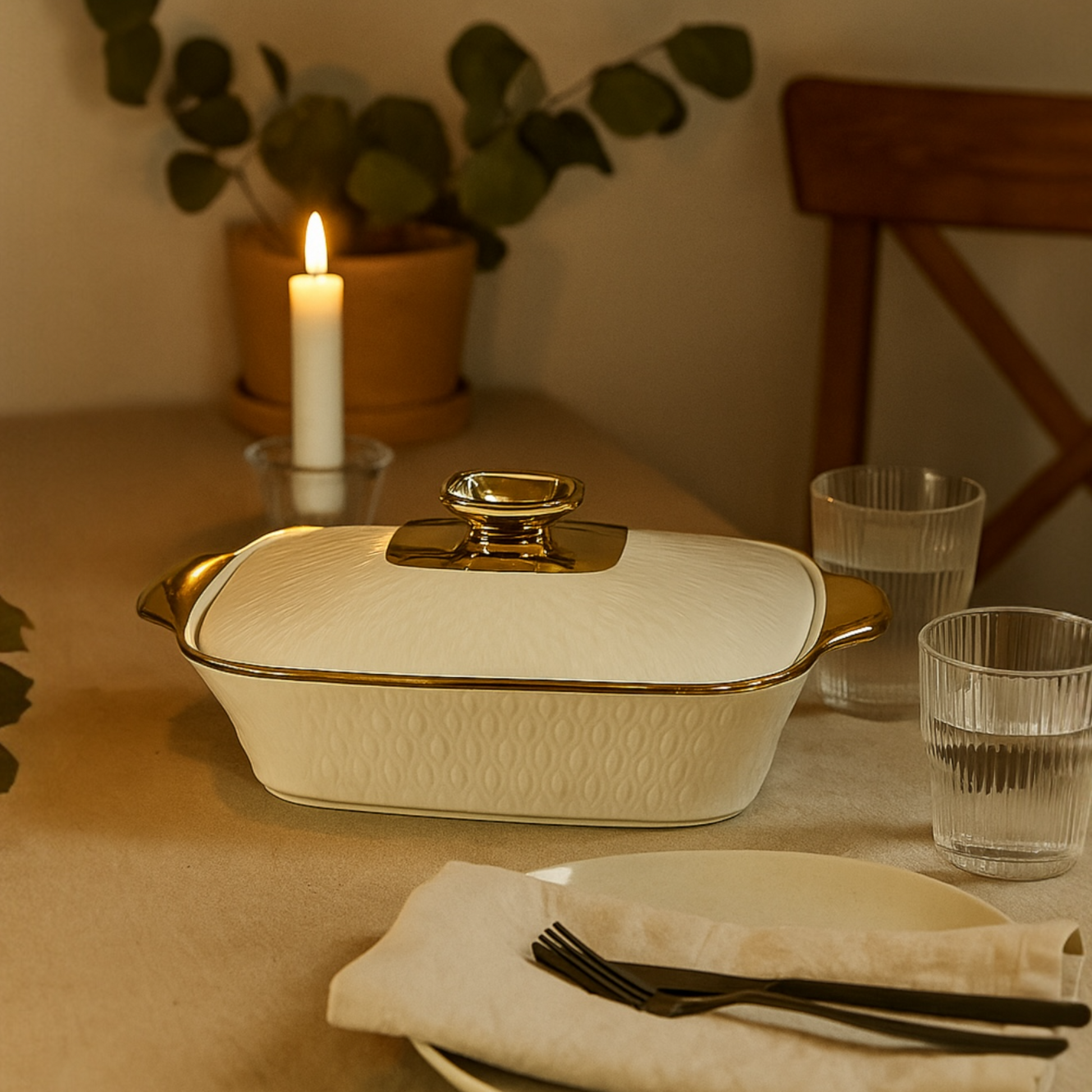 Doré är en exklusiv ugnsform i porslin med lock och gyllene detaljer. En kombination av funktion och sofistikerad design som gör serveringen lika vacker som själva måltiden. Perfekt för gratänger, kött- och grönsaksrätter direkt från ugn till bord.