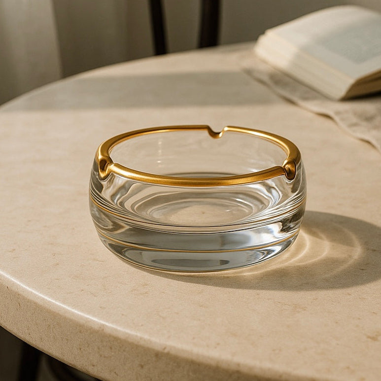Letar du efter en stilren och praktisk askfat? Då är denna glasaskfat med guldkant det perfekta valet för dig. Den är inte bara snygg, utan även enkel att rengöra och håller sig snygg länge.