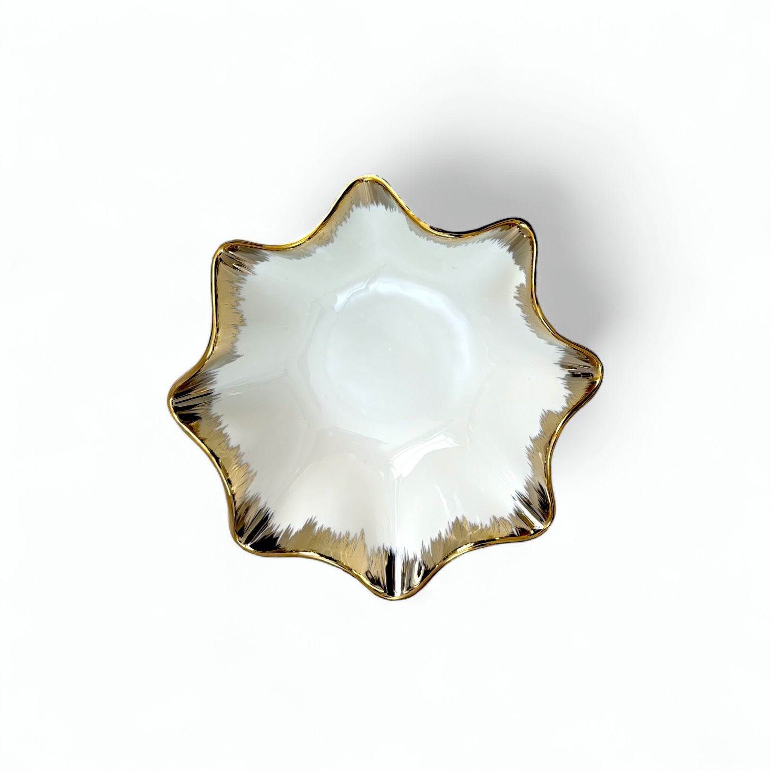 Dessa blomformade skålar är smyckade med en guldig/silver kant som ger en touch av glamour till din findukning. Emmy Skålar är det perfekta komplementet till en vardaglig dukning men även en findukning. Kika in Emmy skål/tallrik/serveringstallrik/serveringsskål/kaffekoppar för att komplettera din servis.