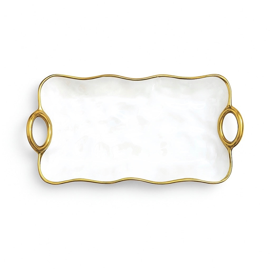 Elegant serveringsfat i vågigt vitt porslin med utsvängda guldhandtag som ger en lyxig touch till din dukning. Perfekt för servering av maträtter, desserter eller frukt – en tidlös detalj som förhöjer varje tillfälle. Kika gärna på Klara tallrikar som ett perfekt komplement från samma serie!