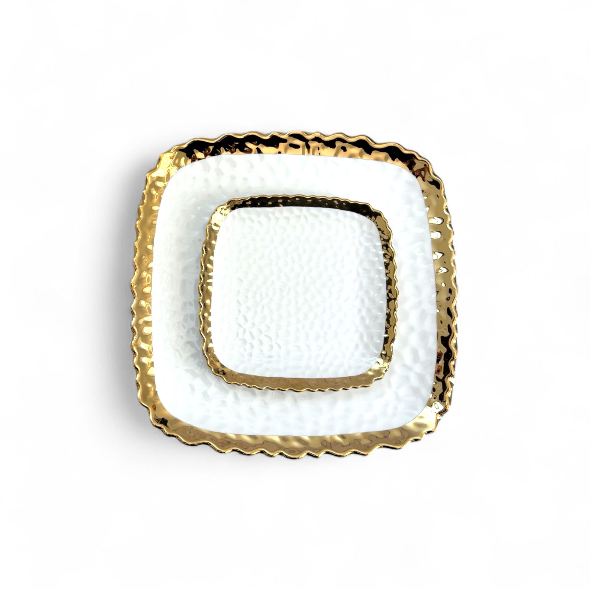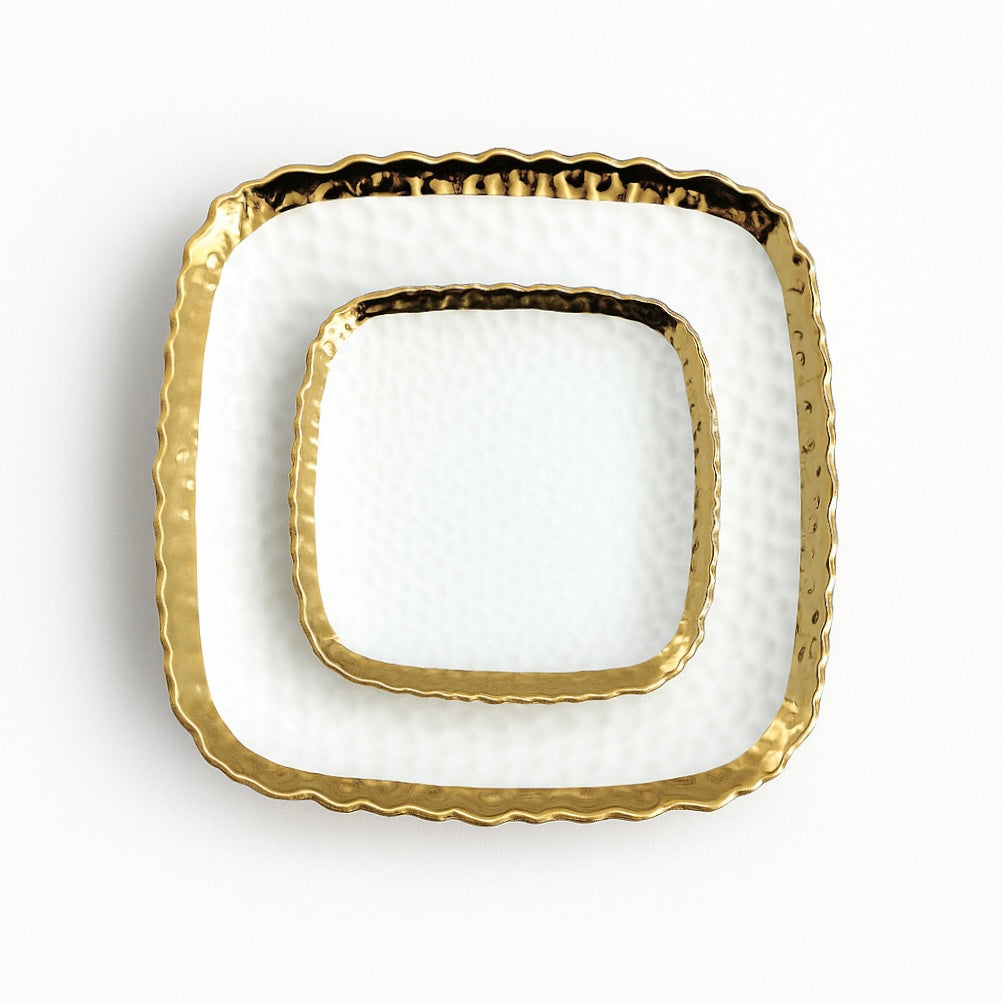 Patti 18-pack porslinsset består av 6 stora tallrikar, 6 små tallrikar och 6 skålar. Setet är tillverkat i elegant vitt porslin med en handhamrad struktur som ger en lyxig och levande yta. De fyrkantiga formerna har mjukt vågiga kanter med handmålade gulddetaljer som ramar in varje del. Den gyllene kanten skapar en vacker kontrast mot det vita porslinet och ger en exklusiv känsla vid varje dukning. Patti-serien kombinerar modern design med tidlös elegans – perfekt för både vardagsbruk och festliga tillfällen.