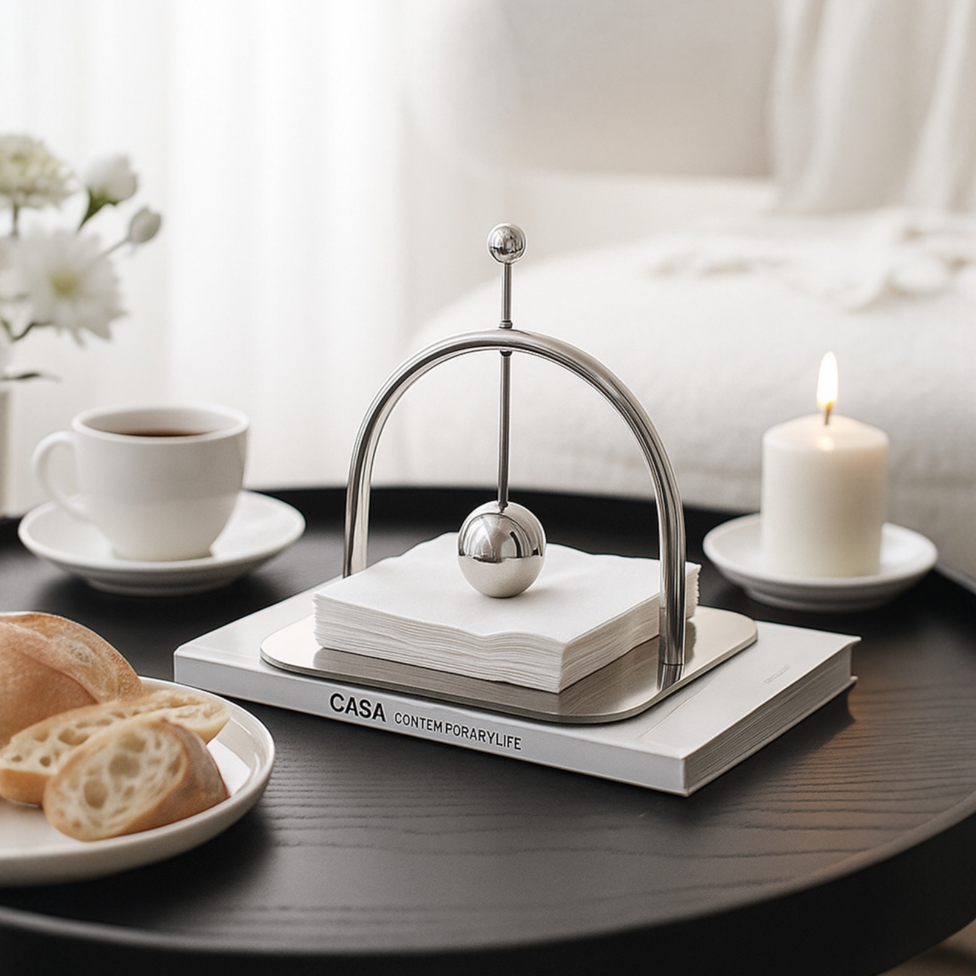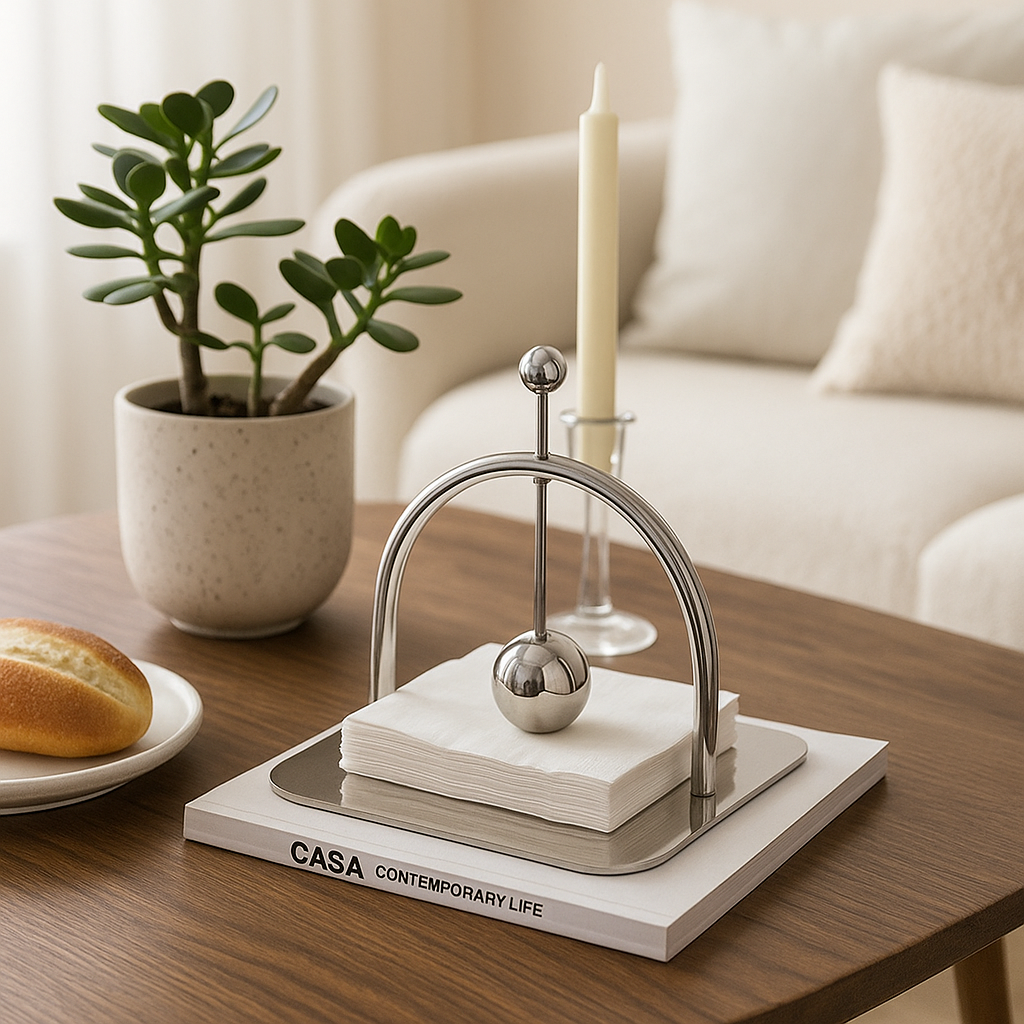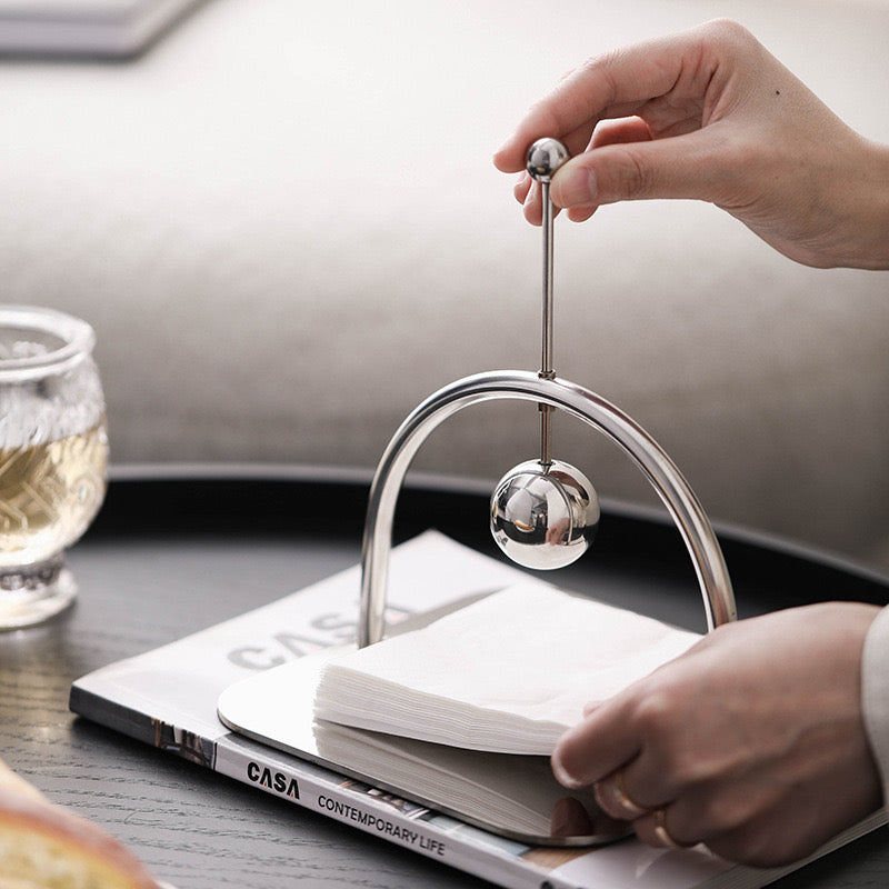 En stilren servetthållare i rostfritt stål med elegant bågdesign och viktkula som håller servetterna på plats. Perfekt för både vardag och fest, och en modern detalj till ditt köks- eller vardagsrumsbord.