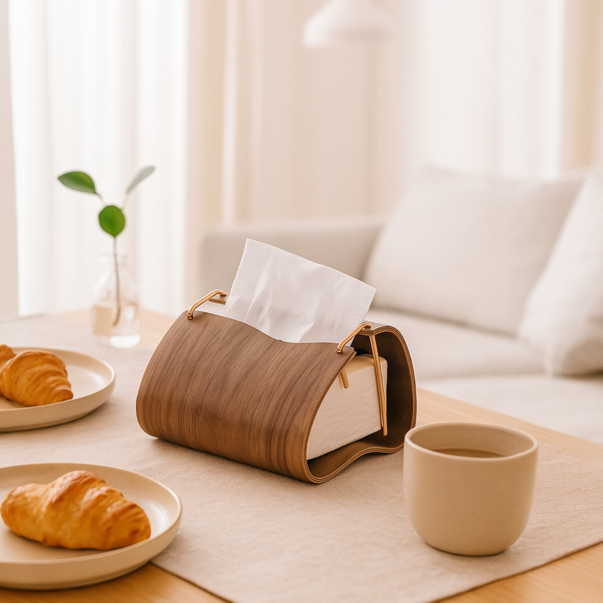 Stilfull servetthållare i trä med modern bågform och metalldetaljer. En praktisk och dekorativ lösning som håller servetterna på plats och förhöjer dukningen i kök, vardagsrum eller matsal.